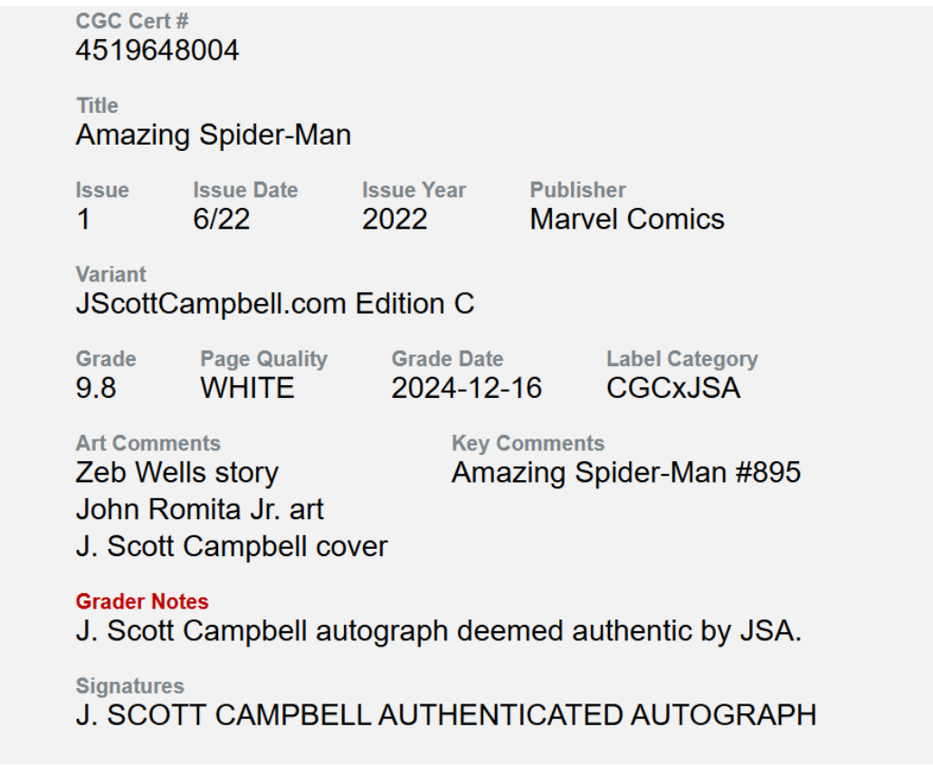 J. Scott Campbell Signature Deemed Authentic by JSA